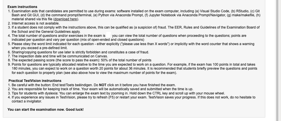 The exact cover page for this year’s exam will be made available on Canvas in advance, so you will not need to spend time re-reading it when starting your exam. Be sure to review it thoroughly before exam day.